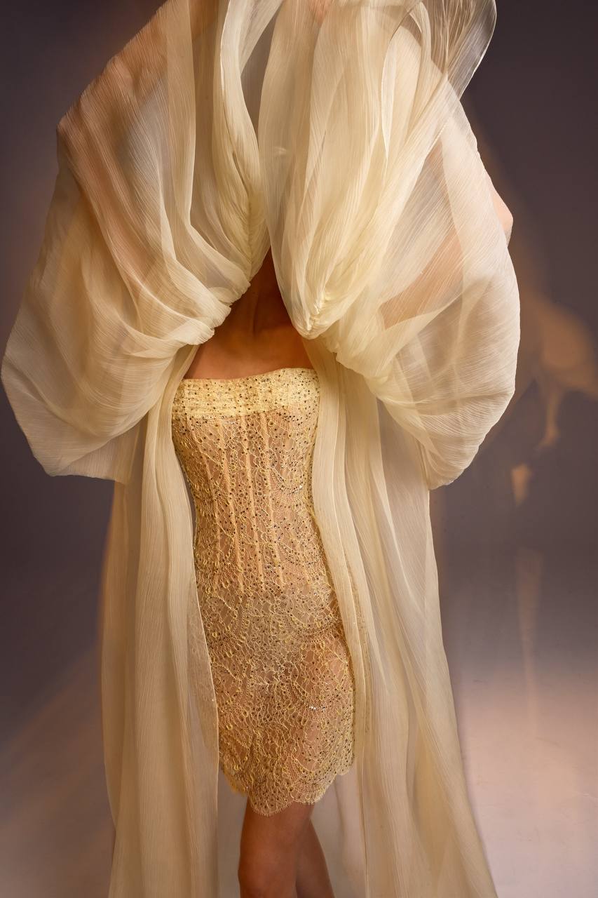 Объемная накидка в нежно желтом оттенке создана из крешированной органзы