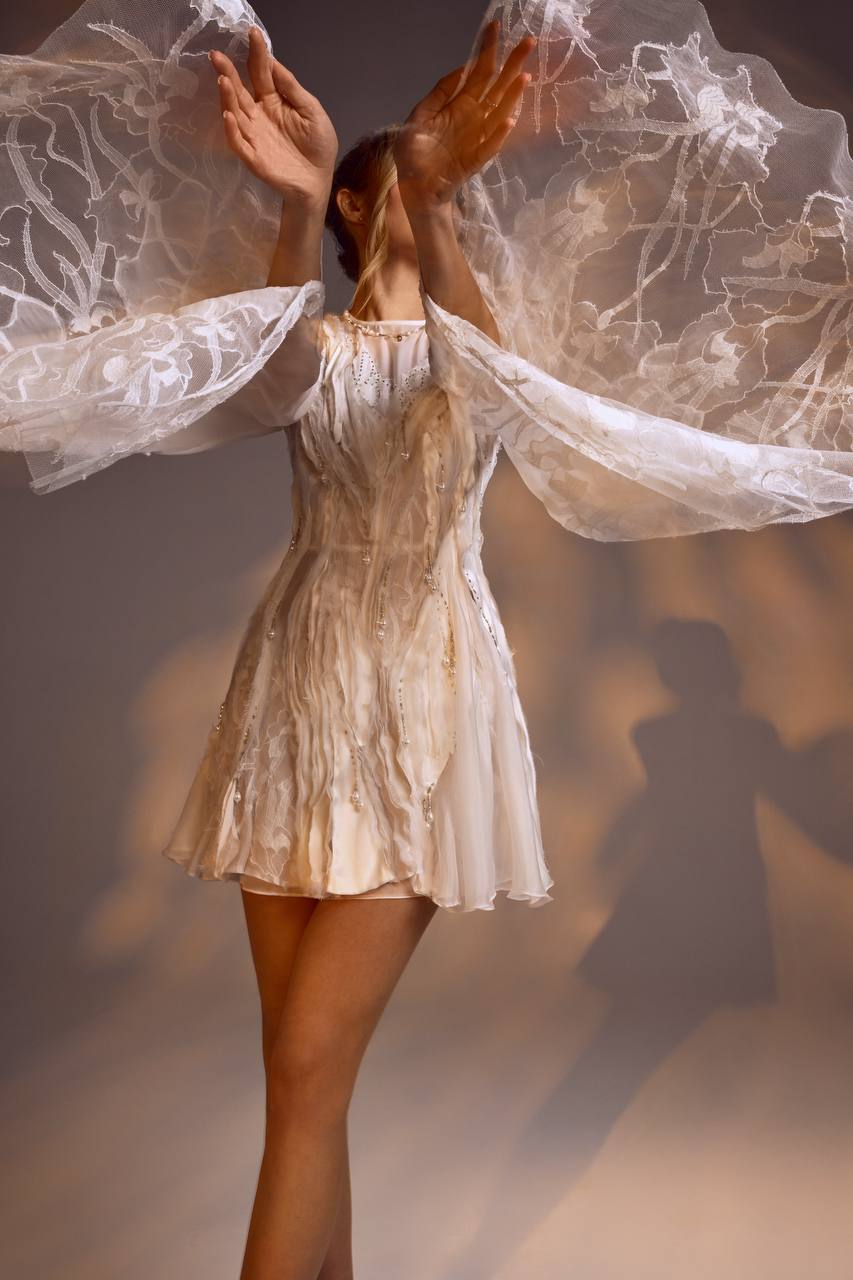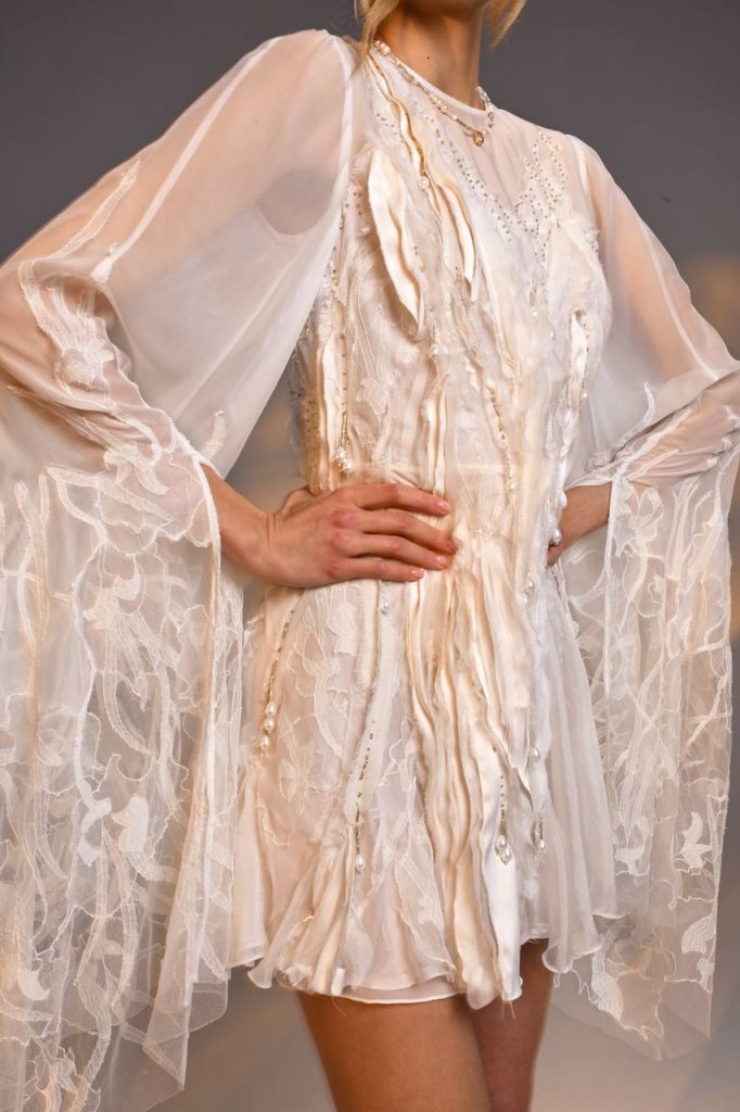 Полотно соткано из кружева, шифона, шелка и расшито жемчугом.